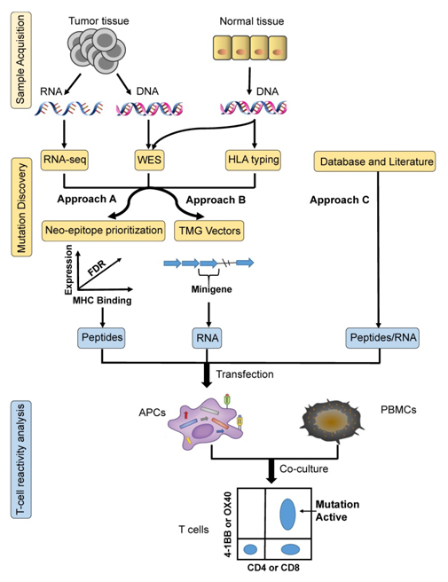 提取患者肿瘤细胞及正常细胞的DNA,进行外显子基因组测序(Whole-exomesequencing,WES)找出肿瘤细胞发生的基因突变。提取患者肿瘤细胞的RNA,进行RNA测序(RNA-Seq)确认这些突变的基因确实在肿瘤细胞中有所表达。提取患者正常组织进行HLA测序,确认递呈肿瘤抗原到细胞表面的MHC分子(在人类简称HLA)。